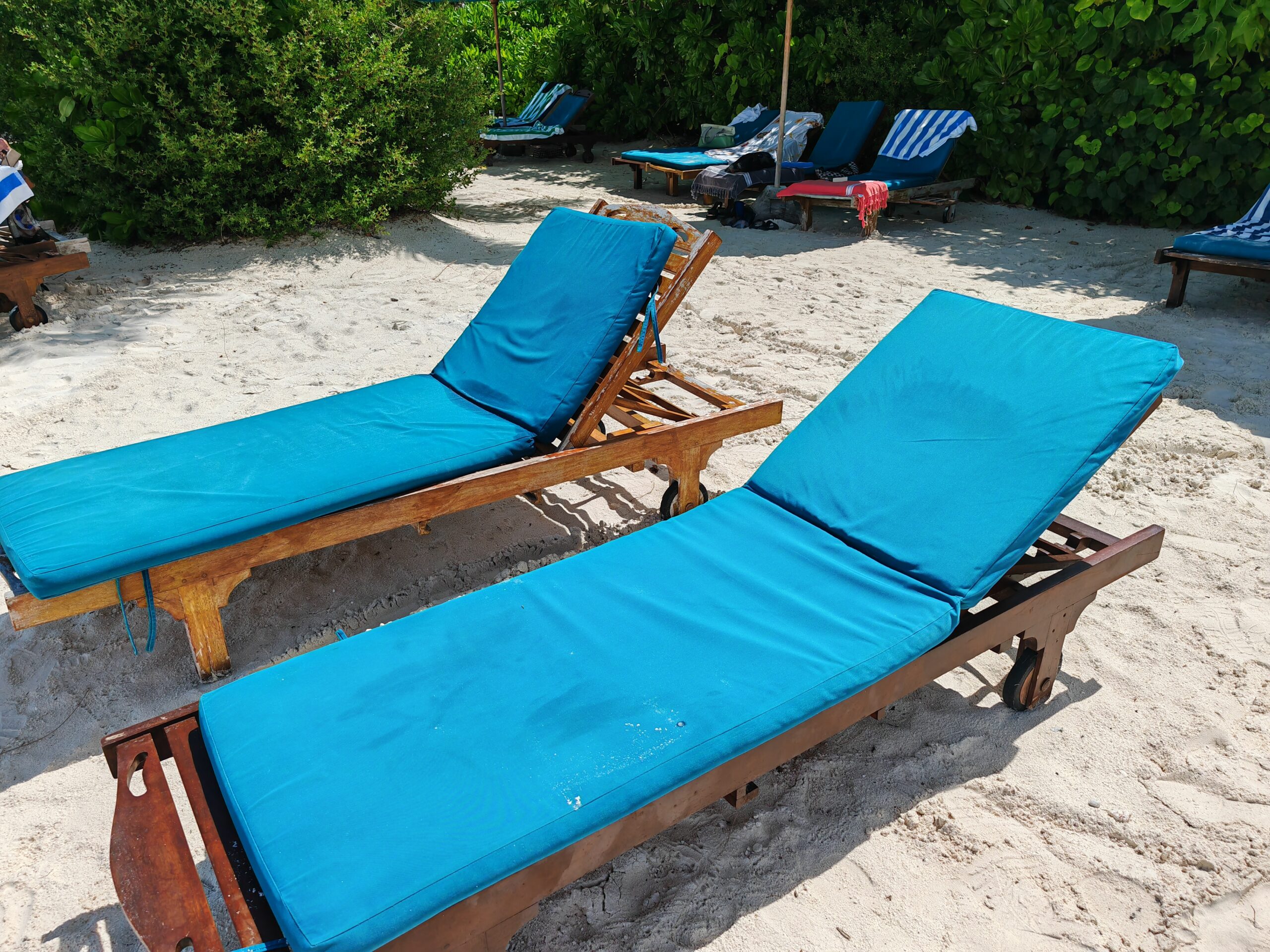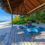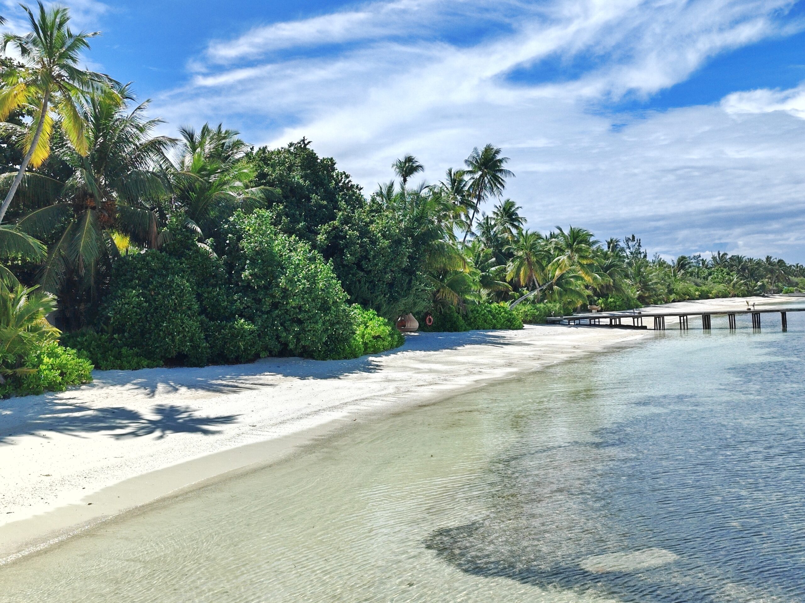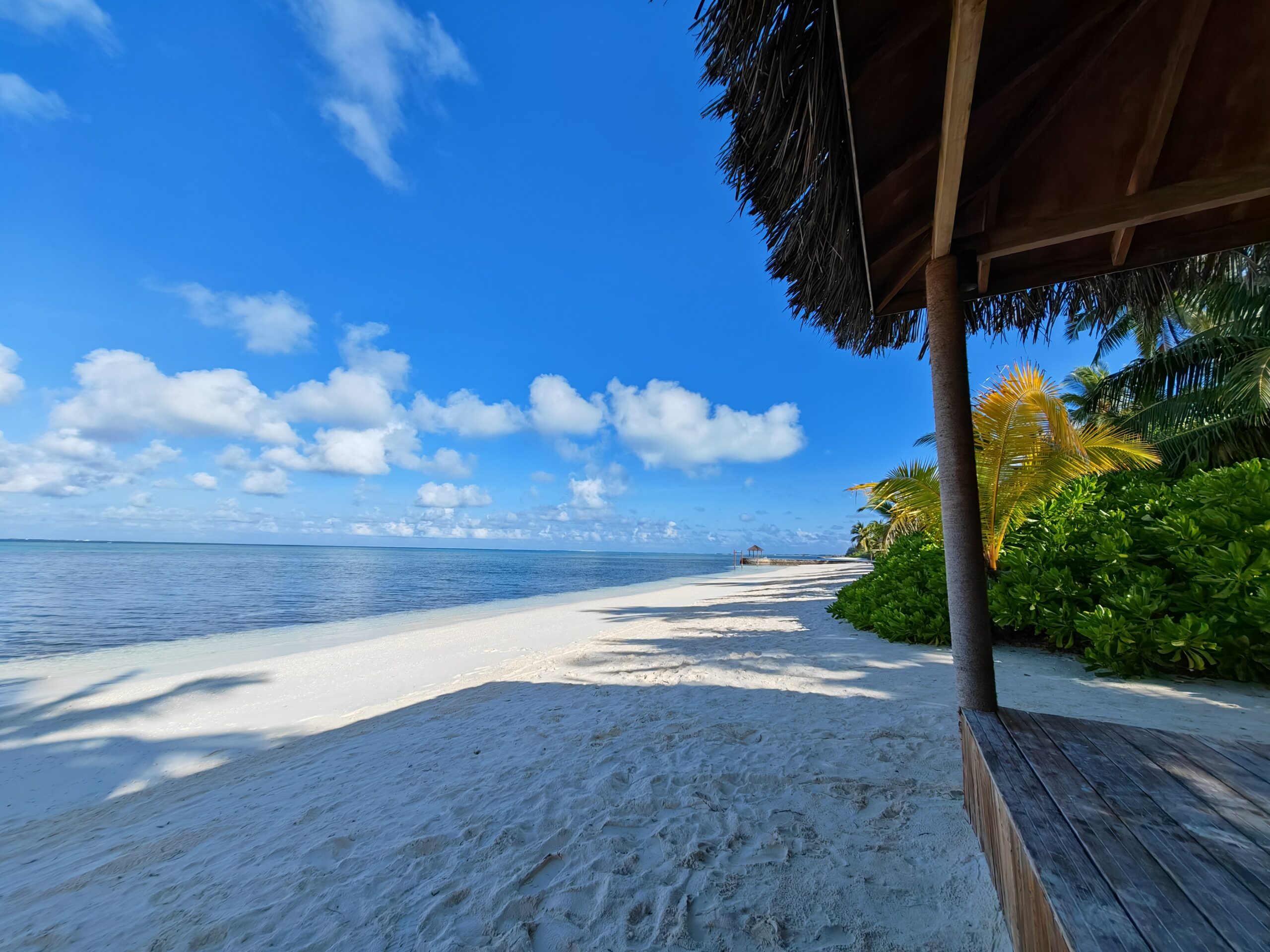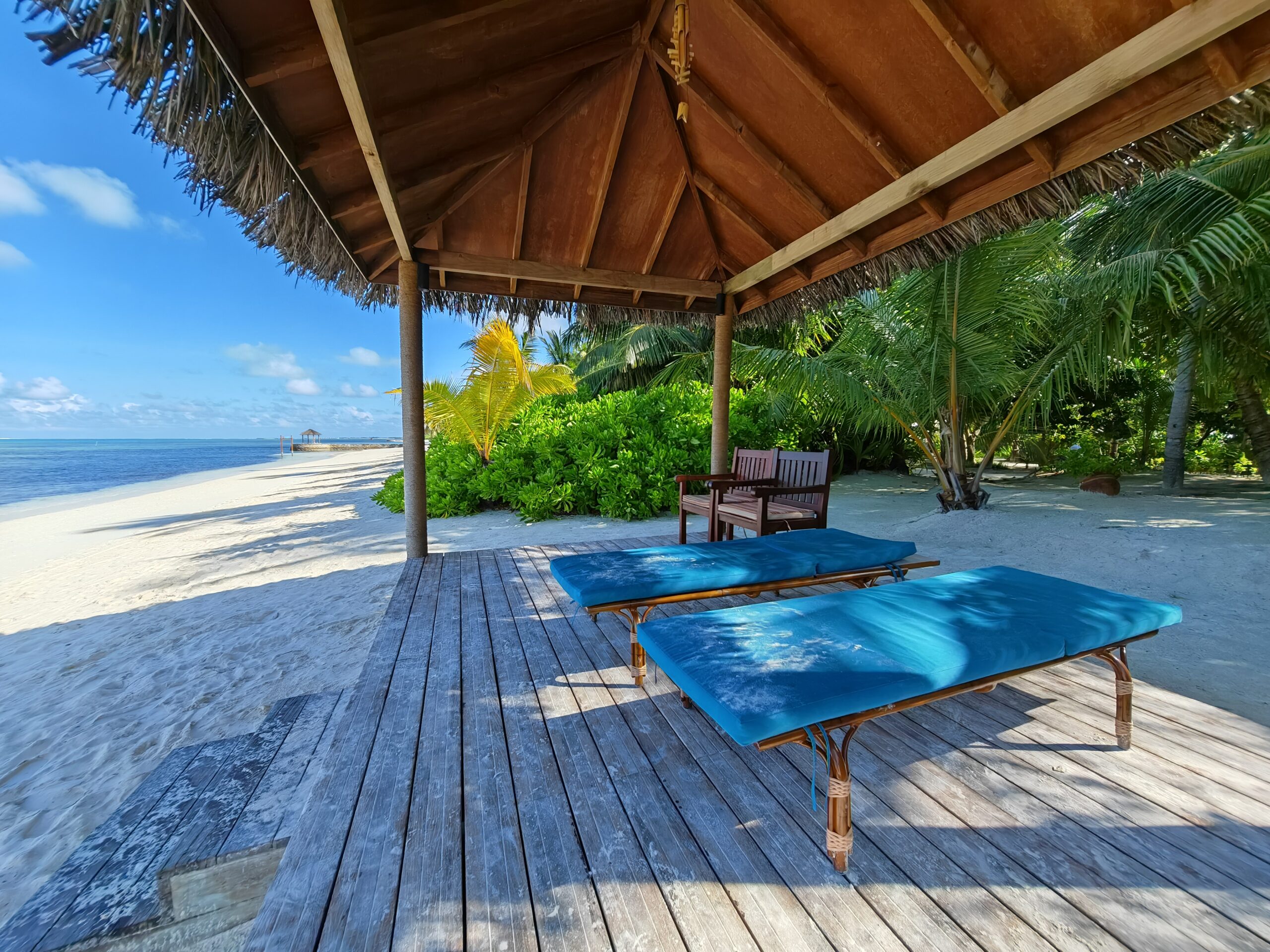 Die Sunset Villas auf der Westseite haben das ruhigere und tiefere Wasser direkt vor der Terrasse. Hier kann man vom eigenen Strandabschnitt aus ins Wasser gehen, ohne lange zu laufen. Das Riff liegt nah, die Sicht ist gut, und man begegnet Fischen bereits in Hüfthöhe. Wir haben hier morgens vor dem Frühstück geschnorchelt, ohne ein einziges anderes Gästepaar zu treffen. Das Licht in den ersten Stunden nach Sonnenaufgang, wenn es noch von der anderen Seite kommt, taucht alles in ein warmes Gold.