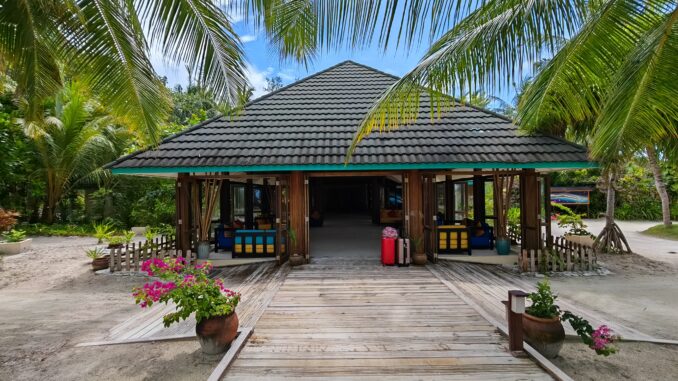 Die Insel ist groß. Wirklich groß. 4,5 Kilometer lang, und die Villas verteilen sich über die gesamte Länge. Wer am nördlichen Ende wohnt und abends ins Hauptrestaurant will, braucht den Buggy-Service, und der kommt nicht sofort. Einplanen.
